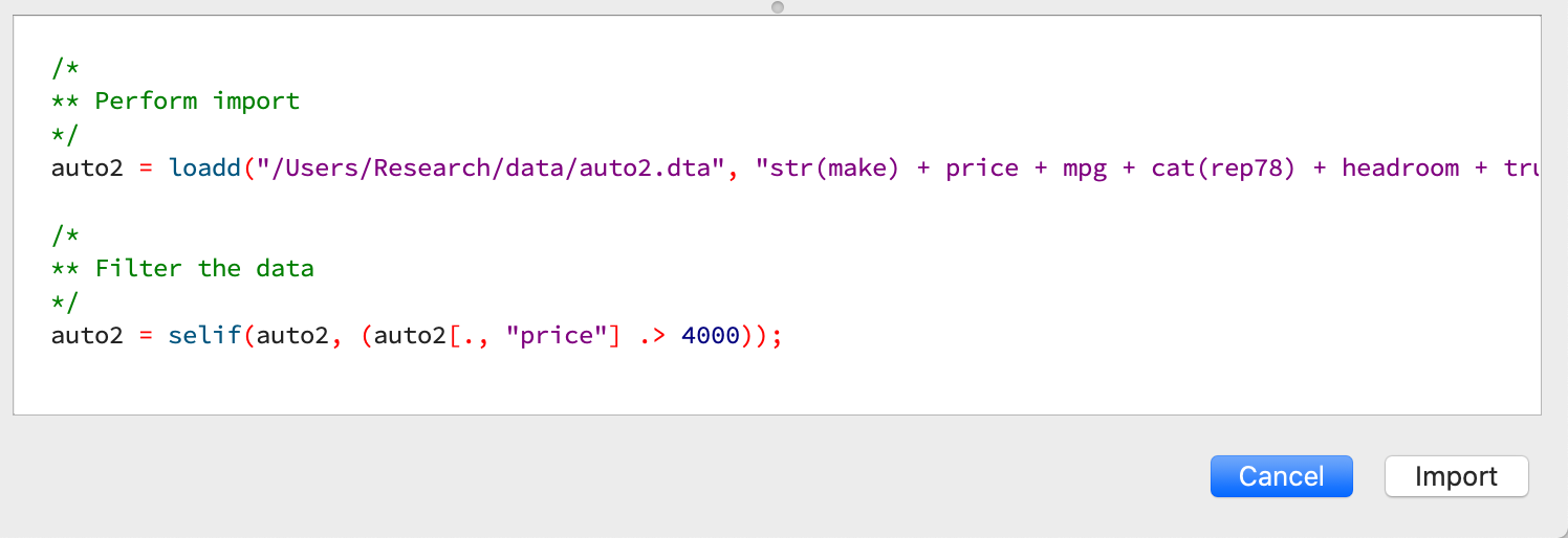 The Data Import window auto-generates code to perform all the import and filter steps. This is the actual code that is run to import the data. Therefore, you can copy-and-paste this code from the Command History to a program file to repeat these steps.