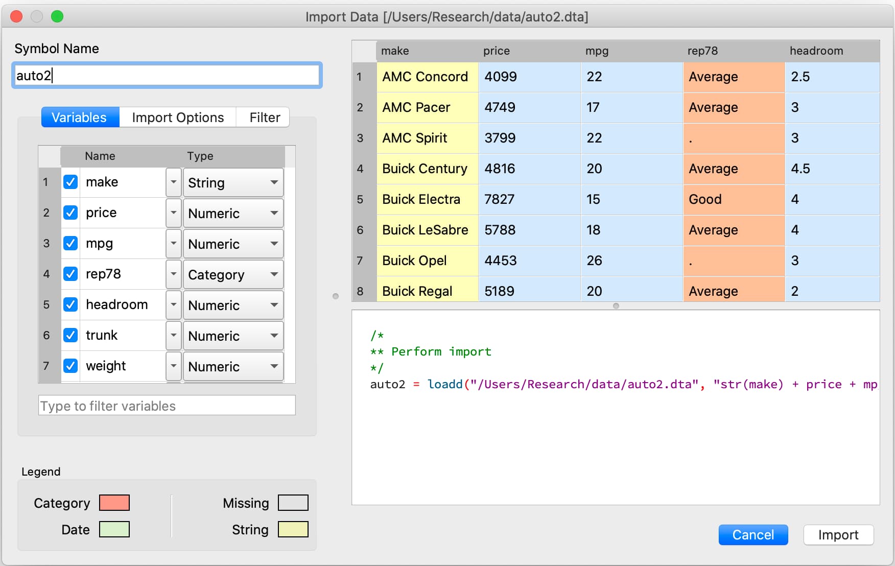 - Keep Metadata: If checked, the data will be imported as a dataframe with variable names and column type information (category, date, numeric, string). Otherwise the data will be imported as a matrix or string array.